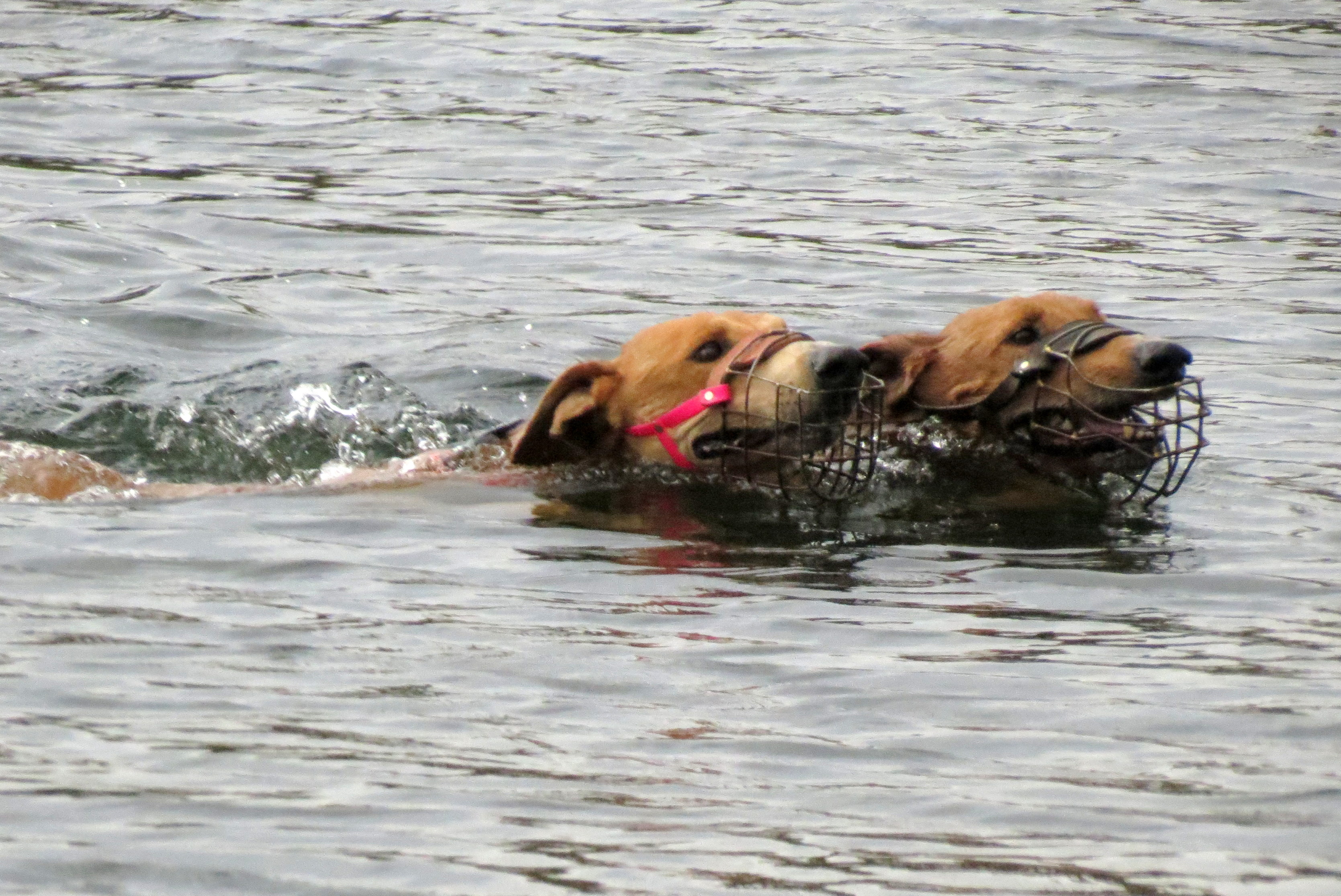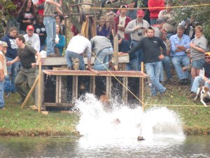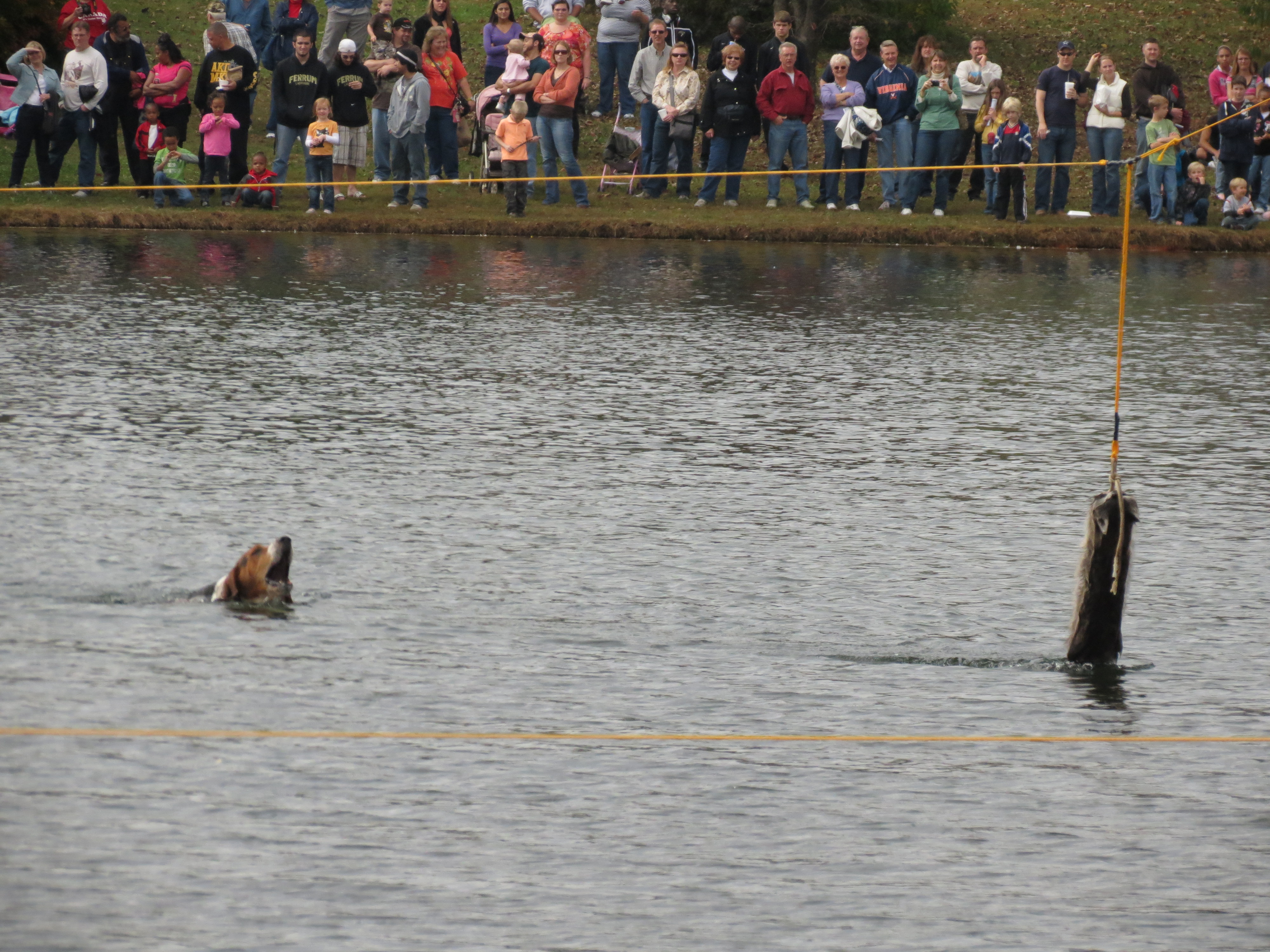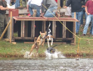It was standing room only around the lake as folks prepared to watch the coon dog races.  The dogs are enticed by the smell of the racoon and when the doors are opened, the dogs leap into the water and give chase.