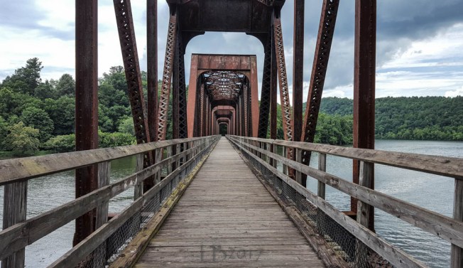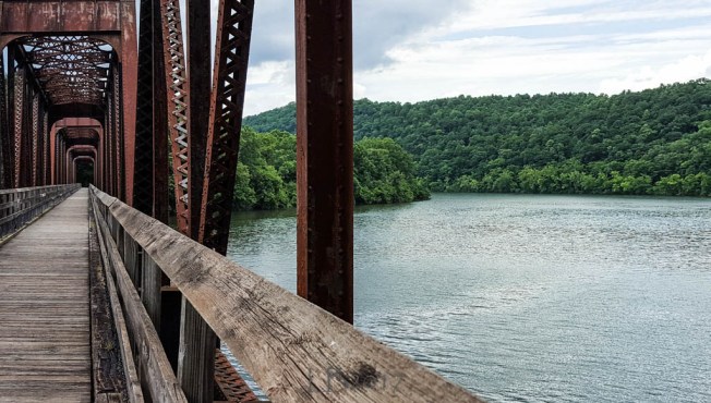 The trail has two tunnels, three major bridges, and nearly 30 smaller bridges and trestles. These photos, taken one after the other as I moved closer to the center of the bridge, are of the Hiwassee Bridge which is 951 feet in length.