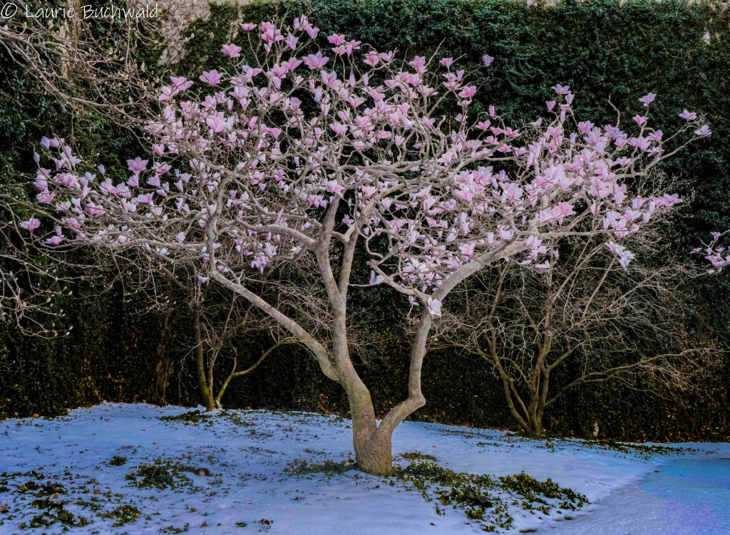 Once we got back to the North side of the Allegheny, we enjoyed public art, a greenspace called Magnolia Park with gorgeous blooms contrasting with the snow on the ground, and a frozen fountain.